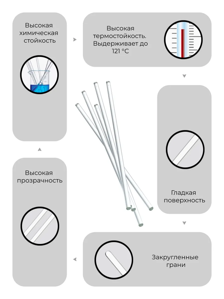 Стеклянные палочки для перемешивания — это незаменимый инструмент для работы с жидкостями, густыми пастами и гелями. Они идеально подходят для размешивания различных растворов, включающие агрессивные химические вещества, такие как кислоты и соляные растворы.